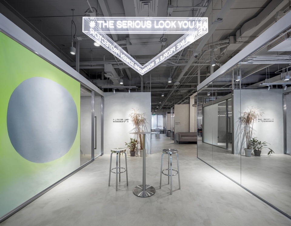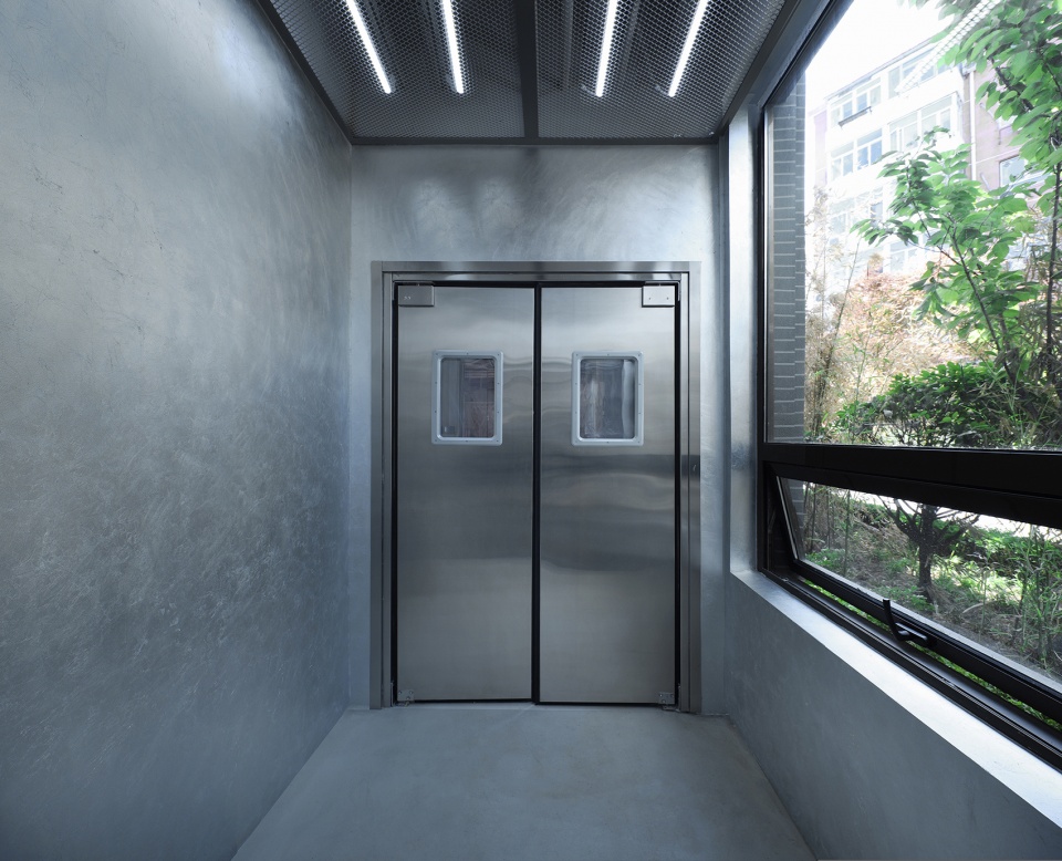 空間有兩個入口,主入口保證通行和展示,次入口則作為一個工廠的精神象征。設計師采用工廠車間金屬推拉門和防撞門作為工廠的大門,將粗獷銳利的工業(yè)感發(fā)揮到極致。前廳四壁貼有銀箔,作為對電影《Factory Girl》的致敬。