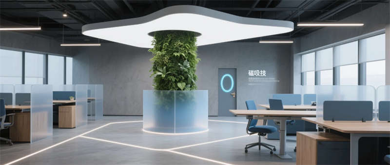 入口大廳以8米寬LED弧形屏呈現(xiàn)動態(tài)視覺沖擊,懸浮曲面黑巖板前臺與天花垂墜的3D打印樹脂裝置形成虛實對話;開放式辦公區(qū)通過模塊化磁吸工位與中央綠植柱,實現(xiàn)靈活協(xié)作與生態(tài)療愈的平衡;總裁辦公室270°全景落地窗搭配懸浮會議島,幾何切割天花與火山石茶臺演繹力量與自然的共生哲學。