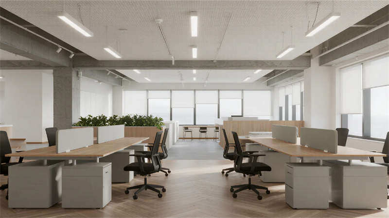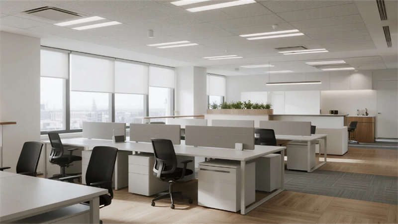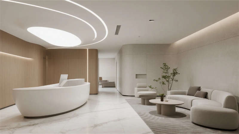 內部空間延續(xù)外部的純凈氣質。企業(yè)大堂以淺白色大理石地面與溫潤木紋墻面奠定基調,弧形純白前臺點綴深藍企業(yè)標識,懸浮線性燈光延伸視覺。右側等候區(qū)模塊化沙發(fā)與綠植盆景營造舒適氛圍,左側數(shù)字影像墻動態(tài)展示企業(yè)風采,淺灰肌理漆背景墻在隱藏燈帶映襯下更顯質感。開放式辦公區(qū)強調高效與靈活,白色穿孔吸音天花下,淺灰可升降桌與黑色人體工學椅組合排列,協(xié)作島與窗邊高吧臺滿足多元需求,淺木紋PVC地面增添自然暖意。高管辦公室運用灰玻隔斷與電動霧化膜保障私密,胡桃木辦公桌、深灰皮質沙發(fā)與嵌入式書柜彰顯沉穩(wěn),無主燈設計營造專注氛圍。公共支持區(qū)模塊化吧臺、淺木紋儲物柜與智能文件柜集成高效服務,細節(jié)處的綠植點綴延續(xù)生態(tài)關懷。整體設計從外至內,以統(tǒng)一的色調、考究的材質與智能化細節(jié),塑造出體現(xiàn)合肥創(chuàng)新精神的智慧辦公新標桿。