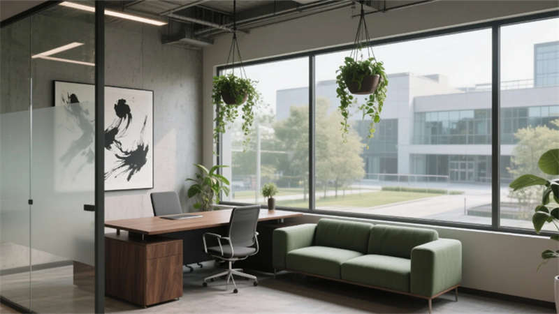 該辦公空間以"自然共生"為核心理念,將科技感與人文溫度融入兩千平米的開(kāi)放場(chǎng)域。流動(dòng)的淺木色調(diào)貫穿始終,啞光金屬與微水泥形成質(zhì)感對(duì)話,模塊化家具構(gòu)建靈活場(chǎng)景。綠植生態(tài)系統(tǒng)從空中吊籃蔓延至苔蘚墻面,模糊室內(nèi)外界限。
