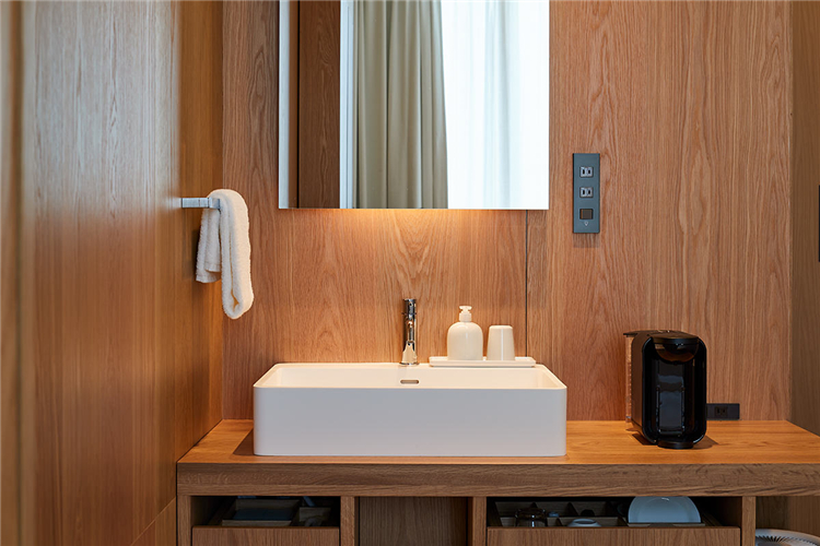 總共79間客房中,最緊湊的客房橫寬僅有2.1米。在這細(xì)長房間內(nèi),配置了讓旅途疲憊者身心徹底放松的元素。如設(shè)置了符合人體工學(xué)的床墊,觸感柔軟的浴巾,柔和溫馨的照明等,營造了超乎尋常的舒適空間。