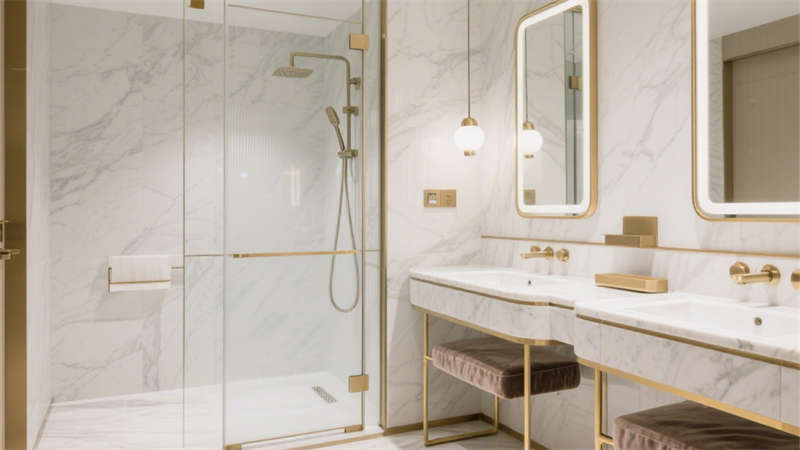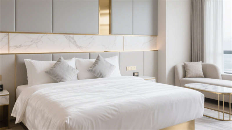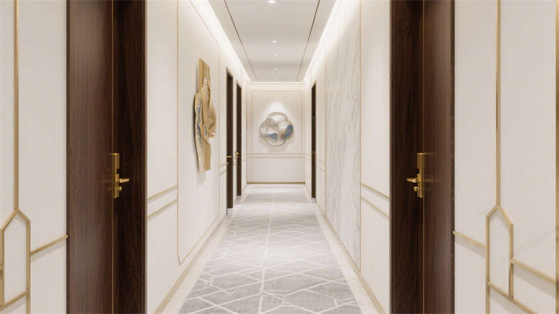 本設計以輕奢風格為核心,通過柔和的基底色調與精致的細節(jié)搭配,構建出兼具質感與舒適度的酒店環(huán)境??臻g以米白色與淺灰色為基礎,巧妙融入金色金屬線條作為點綴,既避免了過度奢華的厚重感,又增添了空間的精致度。墻面與地面選用細膩的大理石紋理材質,在光線映襯下呈現(xiàn)出自然的光澤,提升整體空間的高級感。家具選型注重線條的簡約流暢,搭配柔軟的布藝軟裝,營造出溫馨舒適的居住氛圍。各個區(qū)域在設計上保持風格統(tǒng)一,從公共空間到客房區(qū)域,都延續(xù)了輕奢的設計語言,讓整體空間既富有格調,又能給人帶來放松愜意的居住體驗。