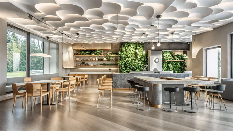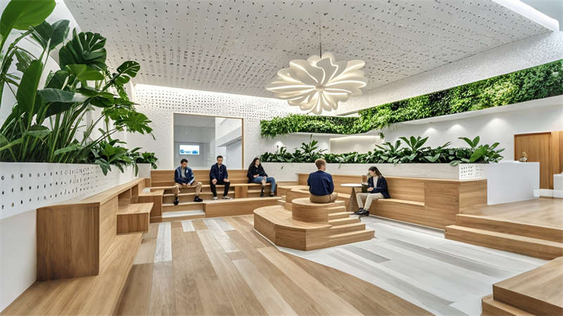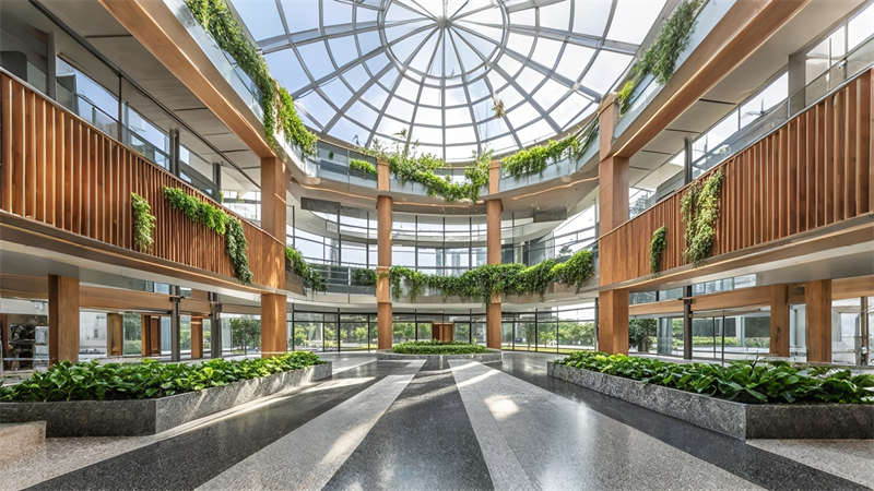 1)中庭三層挑空綠植墻構(gòu)建垂直生態(tài)系統(tǒng),改善室內(nèi)空氣質(zhì)量;