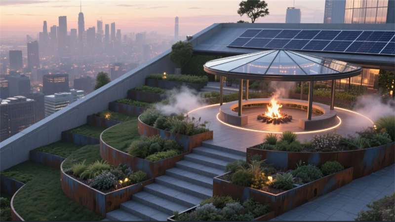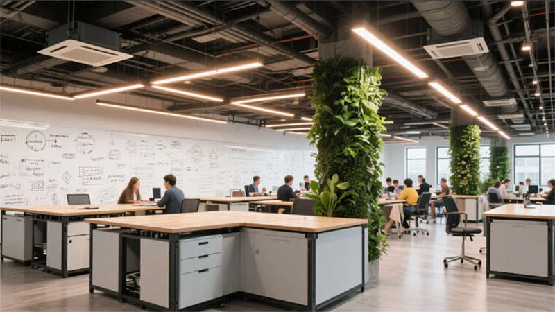 最具突破性的神經(jīng)中樞系統(tǒng)貫穿全樓,自適應(yīng)環(huán)境調(diào)節(jié)光線、溫濕度與聲景,冥想艙的仿生穹頂與創(chuàng)客空間的工業(yè)活力形成張力平衡。屋頂花園成為能量再生場,光伏涼亭與霧森系統(tǒng)在合肥的晴空下營造城市綠洲。
