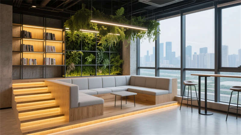健康關(guān)懷融入細節(jié):減壓艙提供冥想庇護,屋頂花園集都市農(nóng)耕與星空社交于一體。實驗室的磁吸墻面與重組工作臺,呼應著科創(chuàng)企業(yè)的迭代基因。整體設(shè)計通過原生材料與科技元素的碰撞,在工業(yè)質(zhì)感中生長出自然生命力,重新定義合肥現(xiàn)代辦公的可持續(xù)范式。