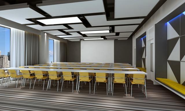 干凈硬朗的員工培訓室設計,符合這個功能區(qū)緊張而又嚴肅的工作氛圍。右側設置有休閑區(qū),搭配幾何造型的立面設計,可以達到調節(jié)工作節(jié)奏的效果。