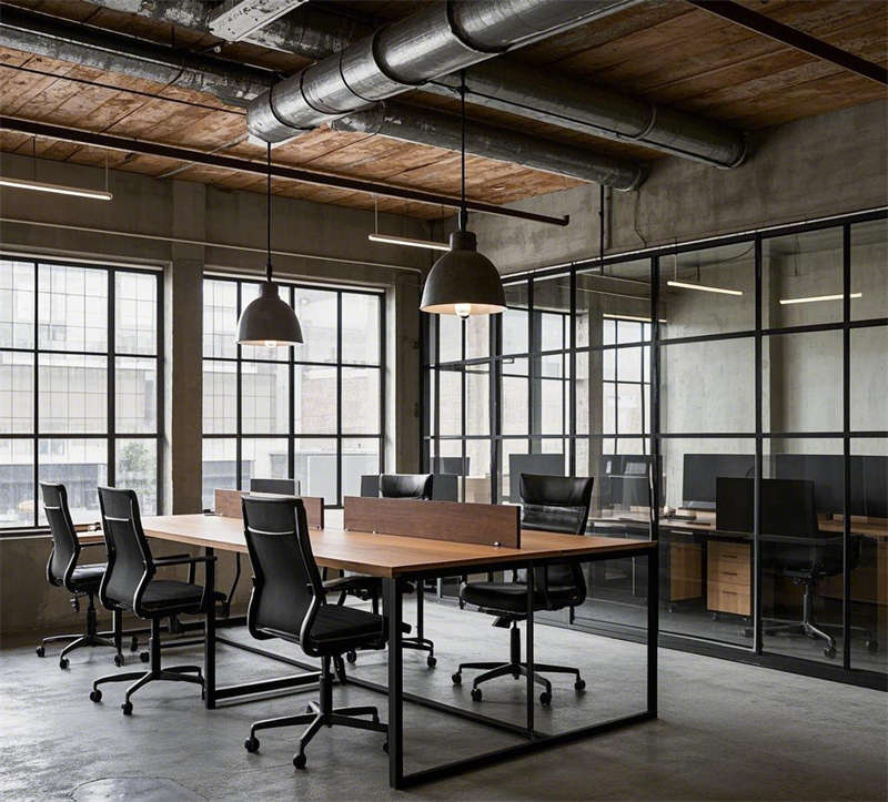 前臺接待區(qū)以深色木質(zhì)桌和皮質(zhì)沙發(fā)為主,搭配暖色調(diào)燈光和綠植點綴,既保留了工業(yè)風(fēng)的硬朗,又增添了溫馨感。開放式辦公區(qū)采用金屬支架桌和玻璃隔斷,既保證了空間的通透性,又提升了工作效率。會議室和經(jīng)理辦公室則通過深色木質(zhì)家具和落地窗設(shè)計,凸顯出高端與穩(wěn)重。休息區(qū)和茶水間以舒適的皮質(zhì)沙發(fā)和金屬吧臺為亮點,為員工提供了放松和交流的空間。創(chuàng)意討論區(qū)則通過不規(guī)則家具和白板墻激發(fā)靈感,而電話間則以玻璃隔斷和隔音設(shè)計保障了隱私需求。整體設(shè)計在保留工業(yè)風(fēng)原始質(zhì)感的同時,注重功能性與舒適性的平衡,打造了一個既實用又充滿個性的辦公環(huán)境。