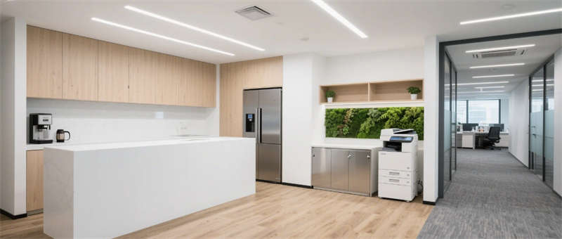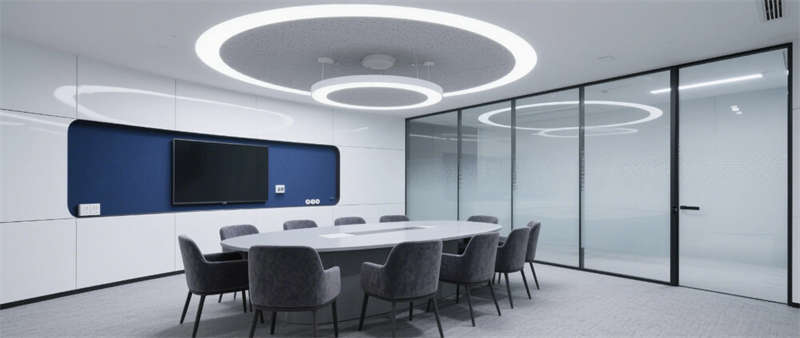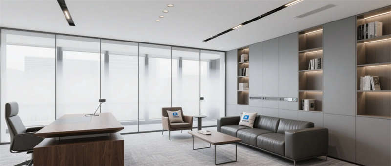 高管辦公室通過灰玻霧化膜實現私密與通透的辯證,胡桃木辦公桌與深灰沙發(fā)組演繹商務美學,隱藏式智能控制系統將科技感融于無形??萍紩h室創(chuàng)新采用環(huán)形桌體與360°攝像系統,陣列麥克風與補光燈帶打造沉浸式遠程協作場景。從光伏玻璃幕墻到模塊化綠植系統,從智能升降辦公桌到節(jié)能設備集群,每個細節(jié)都銘刻著可持續(xù)發(fā)展的空間基因。