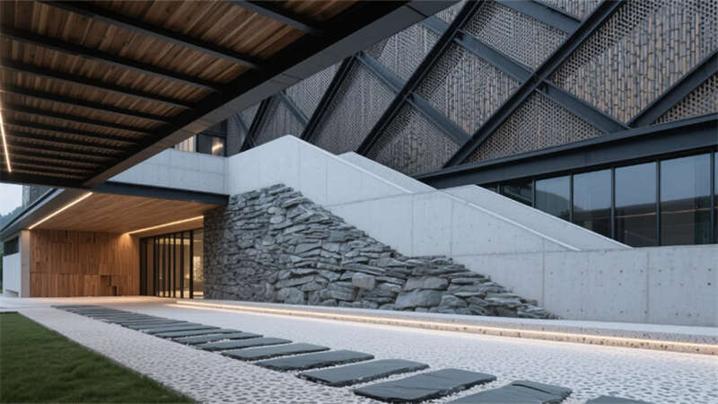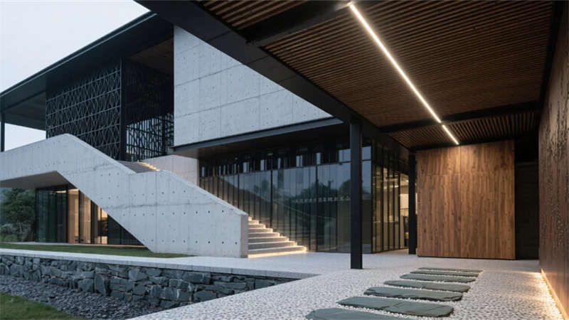 建筑外觀以滁州竹海為靈感,斜交網(wǎng)格結(jié)構(gòu)勾勒出山勢(shì)輪廓,穿孔鋁板在光影間呼吸。懸浮橡木雨棚如云中棧橋,將自然意象引入現(xiàn)代語境。青石板基座延伸至室內(nèi),形成連貫的在地?cái)⑹隆?/p>