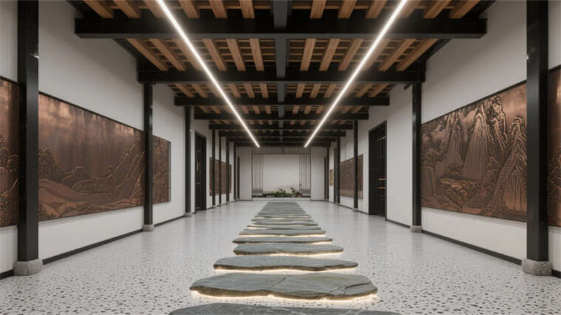 前臺(tái)大廳成為文化凝練的序章:層疊銅藝山形墻在光暈中起伏,夯土臺(tái)面與懸浮木構(gòu)的碰撞隱喻傳統(tǒng)與未來的對(duì)話。紙膜藝術(shù)燈如空中浮云,柔化工業(yè)風(fēng)的冷峻基調(diào)。