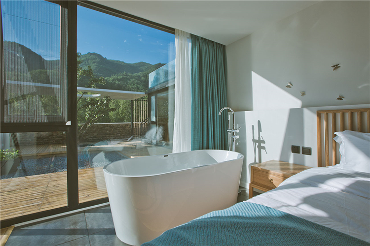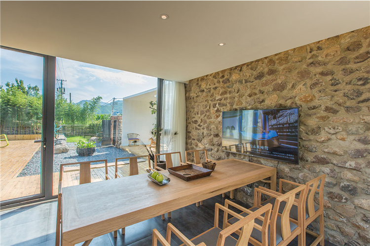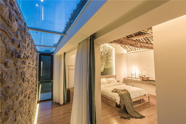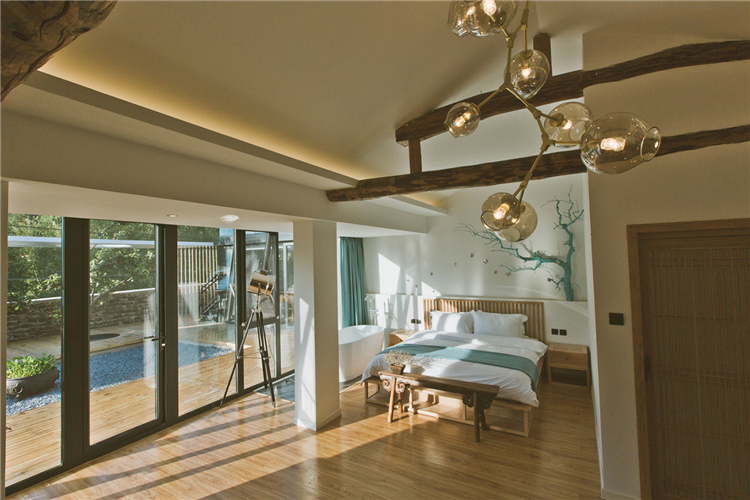 “隨著越來越快的生活節(jié)奏我們每天奔忙,每天遺忘城市越來越近,鄉(xiāng)村卻越來越遠(yuǎn)”。這所名為“畫框里”的民宿位于水泉子村,而名字寓意為將百里畫廊的山水美景留在畫中院中。可看到名副其實(shí)靈動(dòng)的山水畫這四季的變幻,凝集了我們對生活所有的向往。落地窗邊放置了浴缸做一個(gè)泡泡浴一眼望去是院落的美景和遠(yuǎn)山的意境。主臥空間很寬敞,新中式的原木配灰色的簡易家具些許的現(xiàn)代元素金屬攝影燈使房間內(nèi)多一份輕松感。