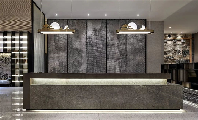酒店在不同層次的設計上靈活運用了徽州文化的核心特點來汲取神韻氣質(zhì),結(jié)合空間的整體系列性,將文化元素滲透到每一個細節(jié)中,將經(jīng)典重現(xiàn).營造極具東方美學觀感的藝術(shù)空間.設計團隊通過對傳統(tǒng)與現(xiàn)代結(jié)合,含蓄與精致并存,兩種不同意境相映成輝,從文化底蘊、材料、軟裝色彩......去推敲空間的序列,實現(xiàn)了酒店的魅力.既體現(xiàn)出人們對當代藝術(shù)與文化的追求,又勾勒出東方意境的沉穩(wěn)靜謐.