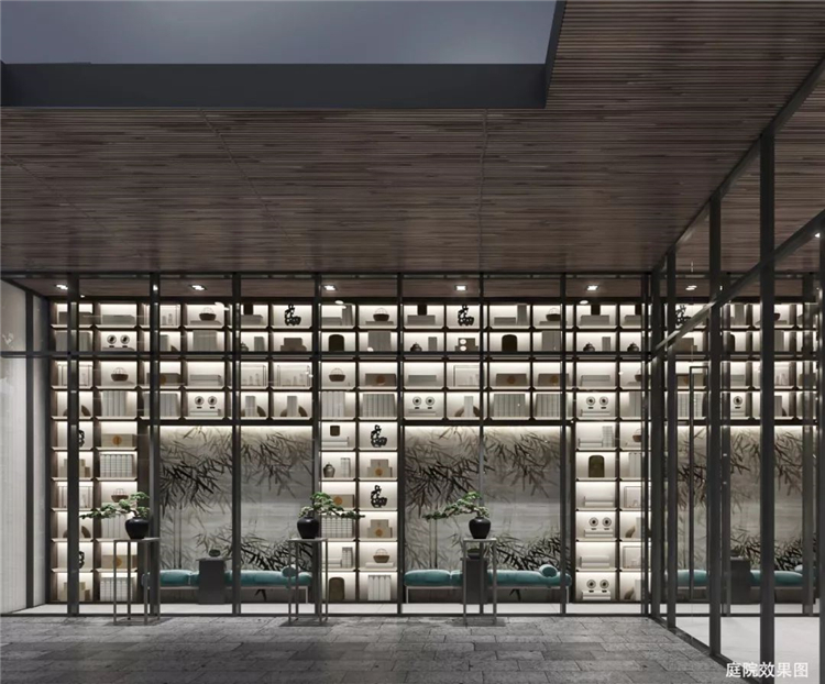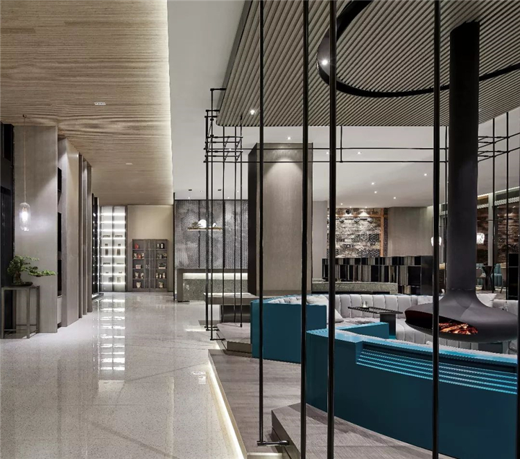 傳統(tǒng)與現(xiàn)代的融合變通,通過汲取傳統(tǒng)徽派的木構(gòu)斗拱、瓦片、留白的山墻和民居的水墨意境,運用新的材料進行演繹,如水磨石的地面、背景墻藝術(shù)圖案結(jié)合金屬網(wǎng)、半透的夾絲玻璃、黑色的金屬構(gòu)建.以寫意的方式提取徽州的意境,延續(xù)徽派建筑的黑白兩色,再點以中國傳統(tǒng)色系軟裝搭配,表達了設計對傳統(tǒng)的回歸和未來的展望.