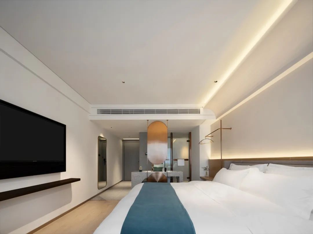 在線條曲度與建筑結(jié)構(gòu)的銜接中交融出感性層面的驚喜,令入住者“循著光”下榻酒店,在體驗(yàn)與感受中為空間注入當(dāng)下的即時(shí)形態(tài),由此,人在空間里是造訪者亦是著境者,是觀賞者,亦是參與者。情與境中,無(wú)盡遐思。