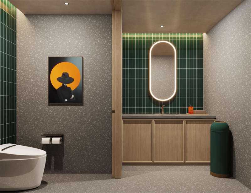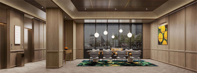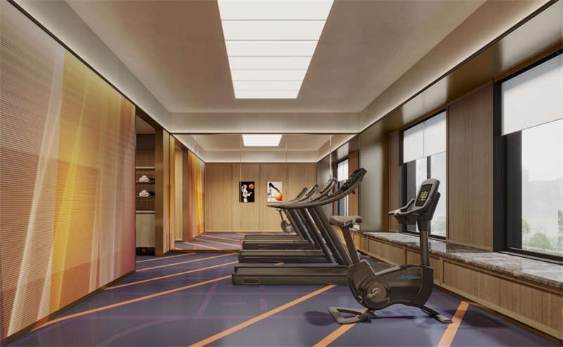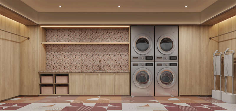 健身房、洗衣房和會議室旨在滿足游客的多功能需求。同時,它們的設(shè)計也與空間風格和視覺美感相對應(yīng)。統(tǒng)一的木飾面作為空間底座,運動紋地膠和定制彩紋點綴健身房的生機與活力。精致的水磨石桌面、咖啡乳膠漆和方形形式的活力圖案地膠為洗衣房增添了柔和感,而開放式會議室的簡約風格則是綠色墻布和定制的博龍地毯的產(chǎn)物。