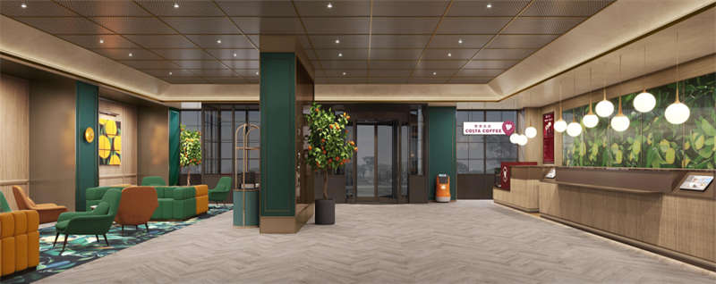 以橙綠色植物作為視覺引導的開端,在吸頂燈球形吊燈下定制了大面積的橙色圖案,拓展了空間主題。印花、地毯和橙綠色軟家具成為伴奏的色彩運動。它們在大堂與客人的感官互動,營造出自然風格和諧的現(xiàn)代城市畫卷。