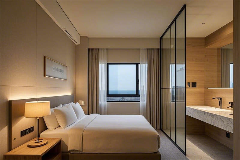 客房設計延續(xù)了現代簡約的風格,淺木色與灰色的主色調搭配,營造出寧靜而舒適的居住環(huán)境。寬敞的落地窗將城市美景盡收眼底,智能燈光系統(tǒng)與電動窗簾為您提供便捷的入住體驗。干濕分離的衛(wèi)生間采用大理石臺面與玻璃隔斷,既實用又彰顯品質,讓您在繁忙的旅途中也能享受片刻的放松。
