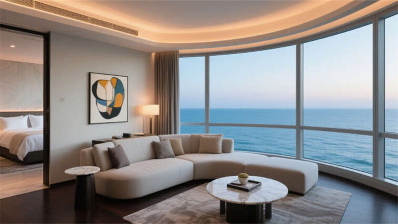 客房區(qū)域強(qiáng)調(diào)“靜謐中的科技感”,標(biāo)準(zhǔn)間通過木飾面隱藏?zé)魩c霧化玻璃衛(wèi)浴實現(xiàn)功能與美學(xué)的平衡;全景套房則以180度落地窗引入自然景觀,臨窗圓形浴缸與雙臺盆設(shè)計重新定義奢華體驗。