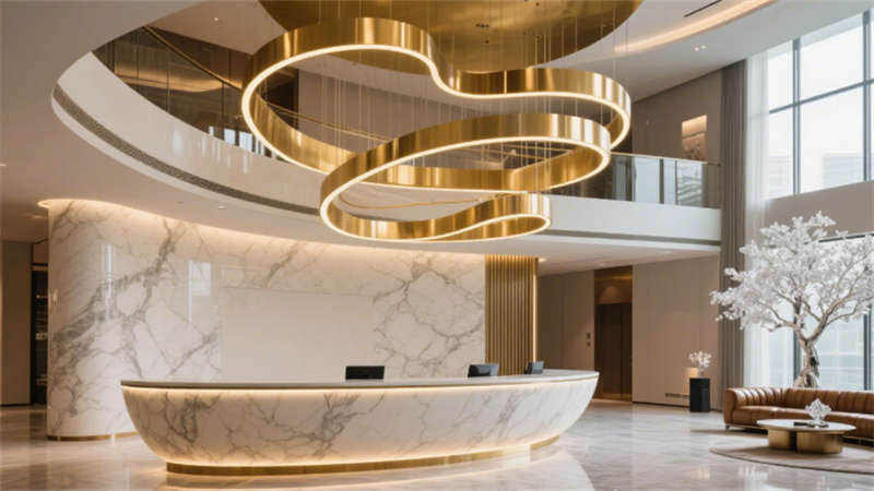 外觀設(shè)計以玻璃幕墻與天然石材的幾何拼接為視覺焦點,日景通過景觀水池倒映建筑輪廓,夜晚則依托泛光照明凸顯立體層次,與城市天際線和諧共生。挑空兩層的大堂以金色流線吊燈與懸浮水晶樹藝術(shù)裝置為核心,大理石地面與弧形LED背光接待臺營造沉浸式抵達(dá)體驗,自然光與暖色燈光交織,傳遞低調(diào)奢華氣質(zhì)。
