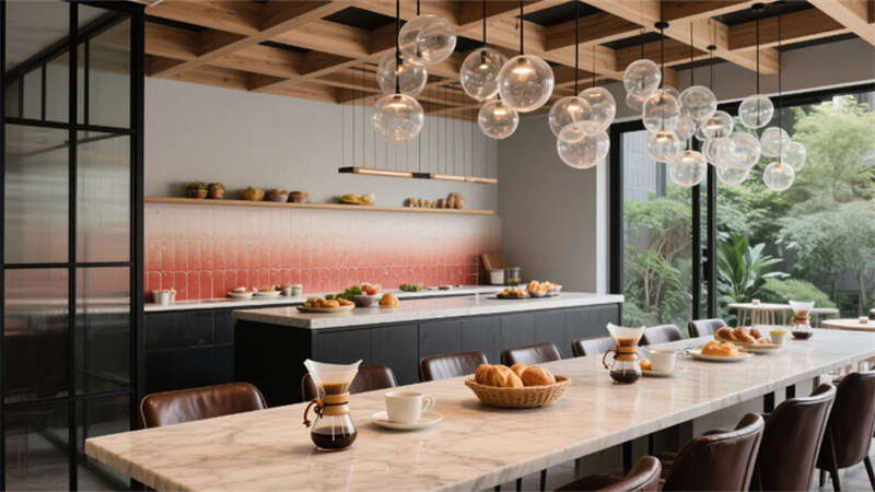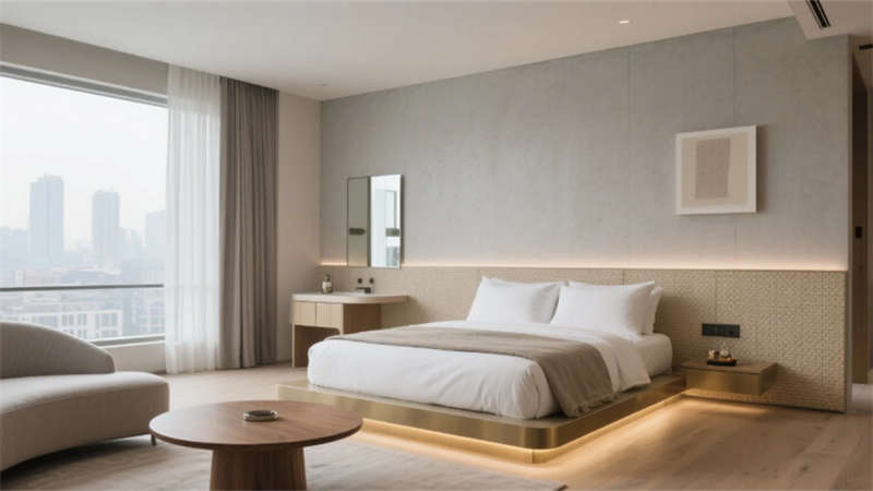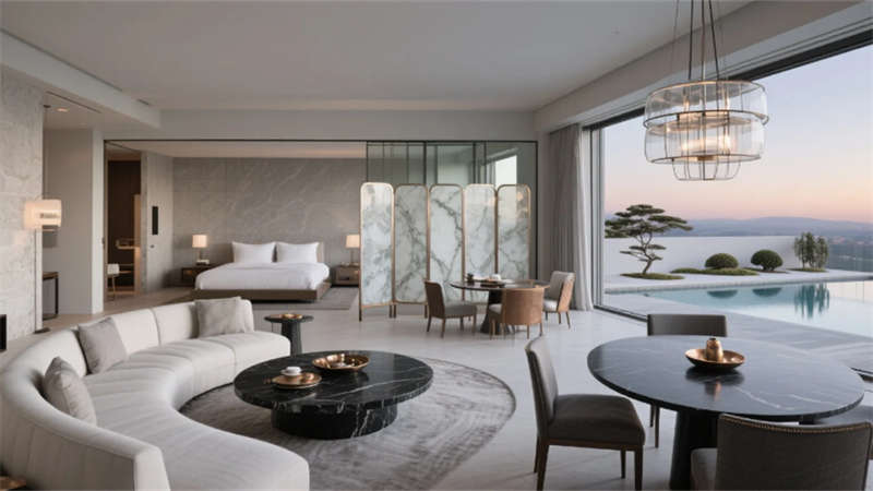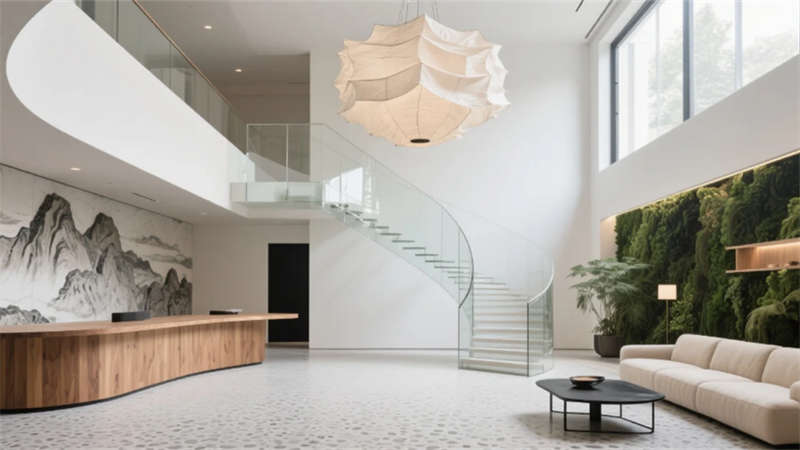 步入挑高的大堂,原木與石材的碰撞詮釋著質(zhì)樸的高級感。懸浮玻璃樓梯如透明絲帶盤旋而上,紙藝褶皺吊燈灑下柔和光暈,綠植墻在隱藏式燈光中若隱若現(xiàn),仿若一幅當(dāng)代山水畫卷??头恳耘遗c米白為基調(diào),亞麻、微水泥與天然木紋織就療愈氛圍,弧形沙發(fā)與嵌入式燈帶讓空間流動(dòng)著溫柔詩意,落地窗將城市天際線化為朦朧背景。