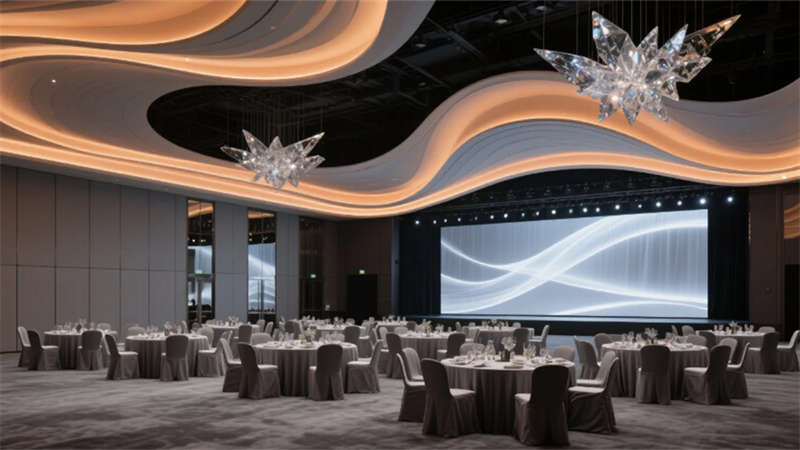 全日餐廳以陶土色格柵天花呼應(yīng)徽州傳統(tǒng)工藝,吹制玻璃吊燈如晨露凝結(jié)空中;宴會(huì)廳則化身未來劇場,波浪形織物天花與全息投影幕布共舞光影。行政樓層的商務(wù)休息區(qū),深灰毛氈墻面與古銅金屬細(xì)節(jié)沉淀出理性優(yōu)雅,窗外綠意透過玻璃隔斷滲入交談空間。從屋頂無邊泳池俯瞰,建筑與巢湖的瀲滟水色遙相呼應(yīng),于繁華處開辟一方隱逸凈土——這里不僅是居所,更是一場喚醒感官的設(shè)計(jì)敘事。