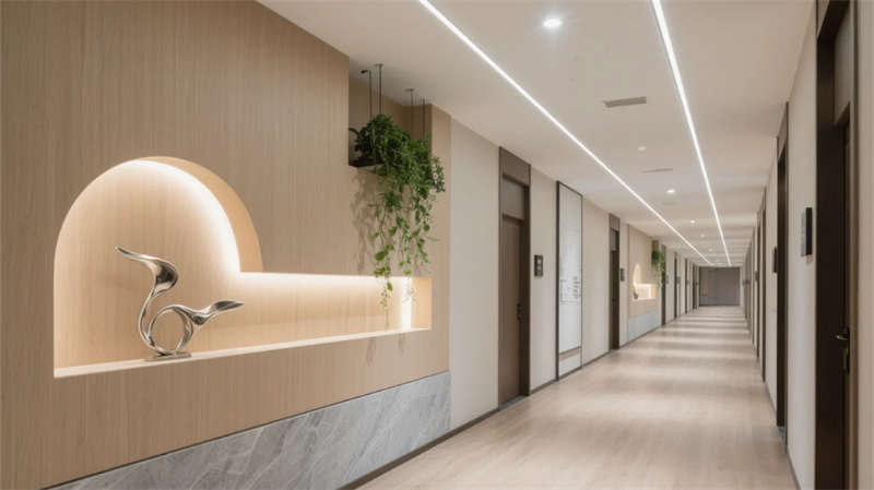 酒店以現(xiàn)代簡(jiǎn)約美學(xué)貫穿始終,走廊作為串聯(lián)各區(qū)域的紐帶,延續(xù)了整體的設(shè)計(jì)語(yǔ)言。弧形壁龕與懸浮天花板的線性燈光,柔和地引導(dǎo)動(dòng)線,淺木飾面與石材的碰撞在低調(diào)中彰顯質(zhì)感。壁龕內(nèi)的藝術(shù)擺件與垂墜綠植,將自然氣息融入過(guò)渡空間,打破傳統(tǒng)走廊的單調(diào)感。