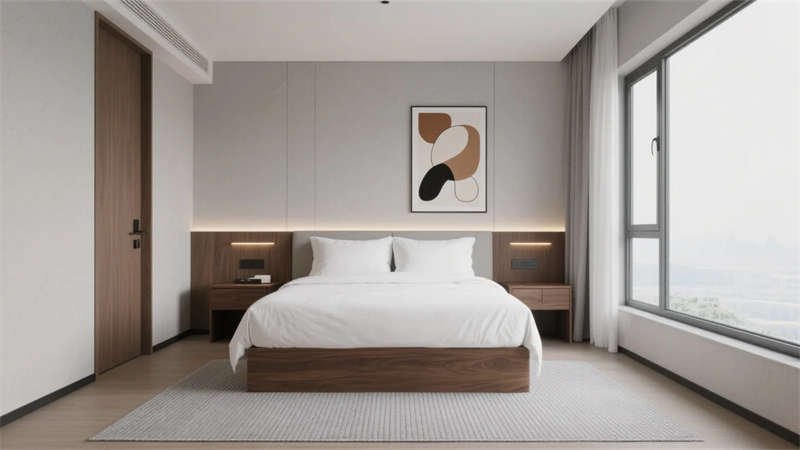 藝術(shù)品陳列成為空間的精神錨點(diǎn)。大堂抽象金屬裝置隱喻合肥科技創(chuàng)新基因,客房手作陶器呼應(yīng)本地文化脈絡(luò),電梯廳的石材拼畫以當(dāng)代語言解構(gòu)傳統(tǒng)山水意境。這些藝術(shù)介入并非孤立裝飾,而是與建筑結(jié)構(gòu)、功能流線深度交融。