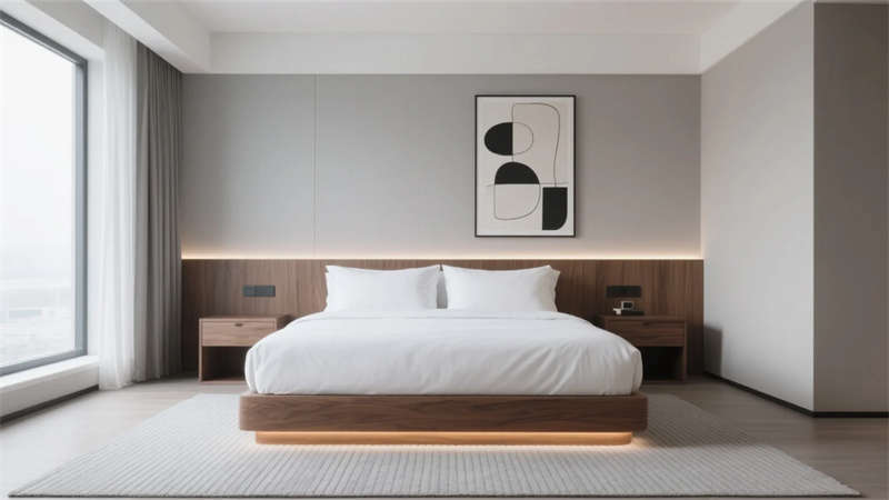 這個商務(wù)酒店的設(shè)計(jì)以現(xiàn)代簡約美學(xué)重構(gòu)城市商旅空間。設(shè)計(jì)摒棄繁復(fù)裝飾,運(yùn)用暖灰與胡桃木的主色調(diào)營造溫潤氛圍,香檳金金屬細(xì)節(jié)勾勒精致輪廓,在理性秩序中注入藝術(shù)溫度。