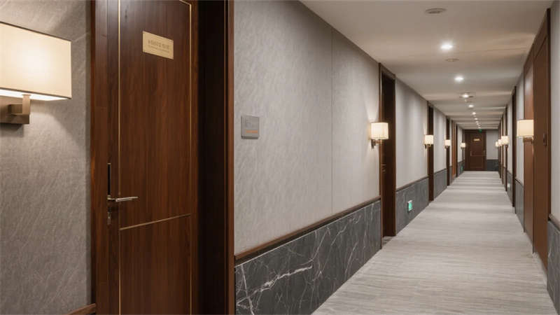 健康關(guān)懷滲透于細(xì)節(jié)設(shè)計(jì)中。健身房落地窗最大化引入自然景觀,橡膠地面與鏡面墻體形成虛實(shí)對話;電梯廳香檳金轎廂與石材墻面碰撞出質(zhì)感層次,每處轉(zhuǎn)角皆設(shè)置藝術(shù)端景,讓行進(jìn)過程成為美學(xué)巡禮。走廊絨面墻體的細(xì)膩觸感消解了通道的單調(diào)性,精心計(jì)算的燈光角度引導(dǎo)賓客自然抵達(dá)目的地。
