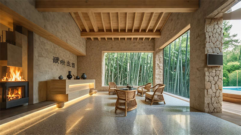 某江淮水岸民宿以“水系文明”為線索,入口設(shè)置霧幕投影再現(xiàn)淝河古渡,走廊地面鑲嵌歷代治水銘文玻璃磚,頂層露臺(tái)通過(guò)光影秀演繹巢湖流域生態(tài)變遷,形成沉浸式文化長(zhǎng)廊。