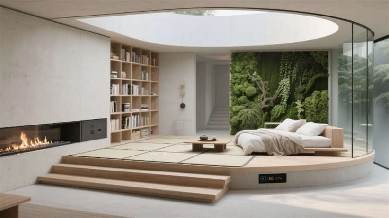 客房以極簡的智慧回應棲居本質。榻榻米地臺消弭床與地面的界限,270°環(huán)景霧化玻璃輕觸即透,仿生綠植在智能光影中呼吸生長,隱藏式投影幕布落下時,星空與林海皆成私享背景。階梯書吧的垂直綠植墻下,模塊化沙發(fā)隨需求自由組合,全息粒子在空氣中勾勒出流動的藝術,而巖板中島餐廳里,藤編座椅與吊燈矩陣的光暈交織,智能調光天窗讓每一餐都浸染著天光的溫度。