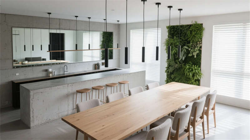 庭院成為生態(tài)樞紐,幾何水景倒映建筑體塊,耐旱植物與灰石板構(gòu)成低維護(hù)景觀。多功能廳通過靈活隔斷適應(yīng)共享需求,藝術(shù)品陳列架隨動(dòng)線旋轉(zhuǎn)生趣。整體摒棄繁復(fù)裝飾,用材質(zhì)本真觸感、光影時(shí)間軌跡與城市山水意境,營(yíng)造大隱于市的當(dāng)代棲居范本。