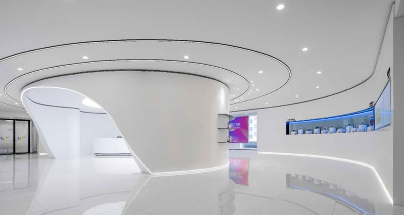 從踏入門廳開始,就劃定了宇宙視界,大廳以天花曲線燈帶統(tǒng)籌整體空間關(guān)系,異形包裹的空間內(nèi),橢圓形發(fā)光燈膜在營造時空感的同時輔助自然光線帶來尤為舒適的光照感為了將空間利用率達到最大。