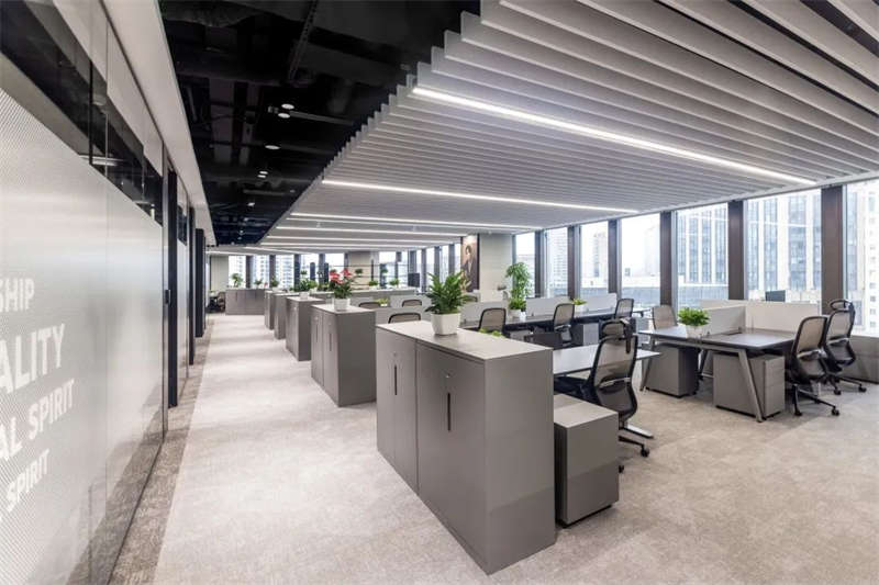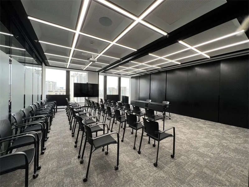 前臺區(qū)的兩條燈帶從吊頂延伸至側墻體底部,光源自上而下具有連貫性。培訓室縱橫燈帶分割出的塊狀吊頂間,在施工時做了整齊對接的處理,以此增加空間的秩序感。齊整化的處理,凸顯出辦公空間嚴格的秩序性。