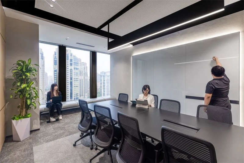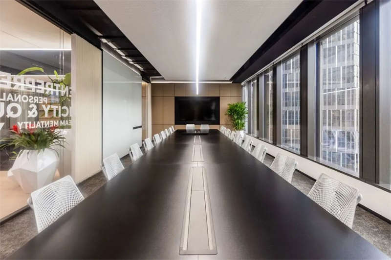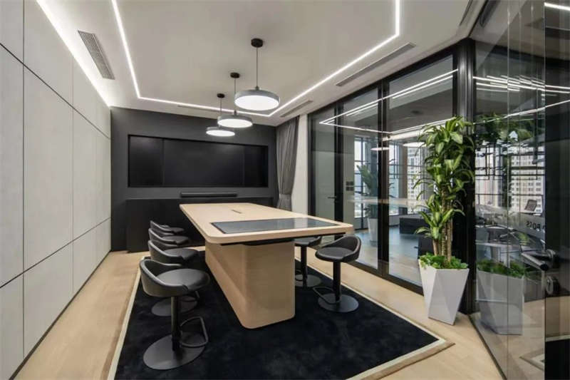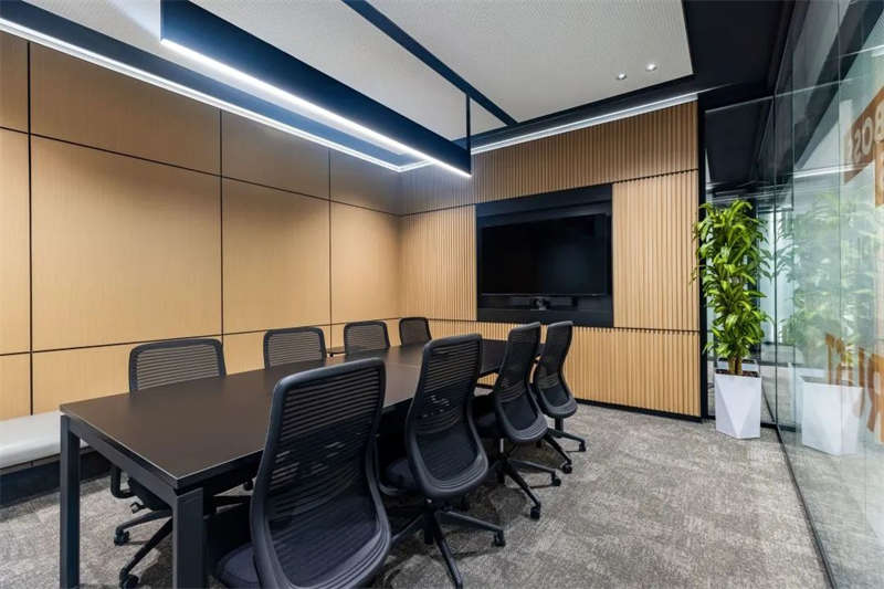 所有的會議室中,電視屏背景墻均以縱橫相交的豎條黑色U形槽做了分塊處理,在電視屏幕安裝位置上保持了統(tǒng)一原則,電視屏垂直居中,上下線條與背景墻上部、底部的距離相等。諸如此類的設計,使得辦公空間視覺條理性得到了加強。