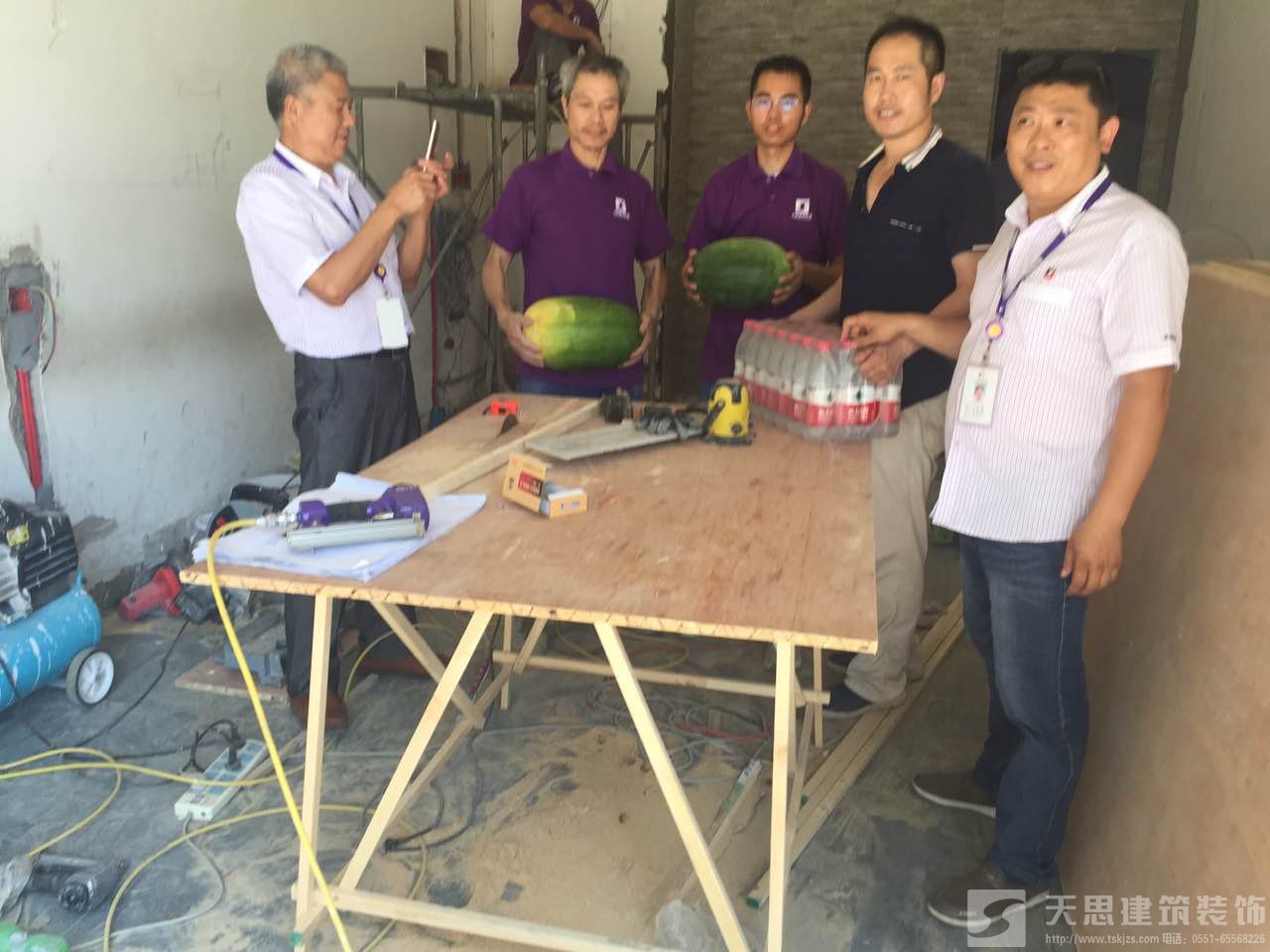 天思建筑裝飾公司為工作在第一線的天思項(xiàng)目經(jīng)理及工人送一點(diǎn)點(diǎn)小小的慰問品,謝謝你們的付出,你們辛苦了。天思一行對(duì)大家為趕工期、保質(zhì)量所付出的辛苦表示衷心感謝,并囑咐工地負(fù)責(zé)人要愛護(hù)裝修工人的身體,在保質(zhì)量為首要前提下抓好安全施工。施工盡量利用早、晚時(shí)間,盡量避開高溫時(shí)段;若發(fā)現(xiàn)有身體不適,要及時(shí)注意休息,情況嚴(yán)重的要及時(shí)送醫(yī)。