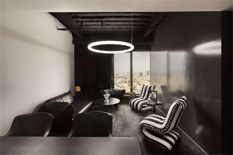 盒子面向“起居室”,這是一個(gè)開放空間,有各種座位,一個(gè)活躍的酒吧作為辦公室的中心。