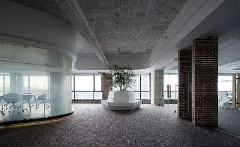 經(jīng)劃分,原本四方的整體空間,大致可歸為公共辦公區(qū)、獨立辦公室、黨建室、互動區(qū)、財務室、會議室、儲藏室、休閑室、檔案室及其他功能區(qū)域。拋去濃烈的墨黑,以灰、白作主色調,既保持了沉穩(wěn)、大氣的理智感,又不使氣氛過于肅靜。前臺加入金色提亮,搭配大理石的紋理質感,活波間亦不落俗,凈土之上雅致盡顯。在簡約現(xiàn)代的輕工業(yè)氛圍下,色彩、裝飾往往點到為止。紅磚墻與藤編椅的原生感,質樸、不造作,在一片素雅的環(huán)境中,如曇花輕綻,為空間注入悄無聲息的生命力。