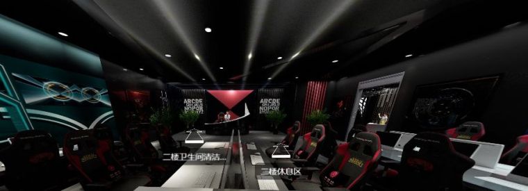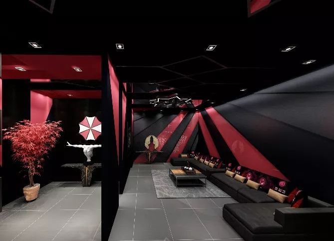 在迎賓區(qū)兩邊,左右分布著男賓區(qū)和女賓區(qū)。相較于普通網(wǎng)咖設(shè)計,電競會館具有賽事承辦上的專業(yè)特色,為了使人更加有比賽所需專注,男賓區(qū)墻面只有簡單的涂鴉,飾物元素也極少,相較于男賓區(qū)設(shè)計較為簡單,女賓區(qū)“紅蜘蛛”主題感十足,頂墻燈光合理搭配來減少黑色來的的壓抑感。男女獨立衛(wèi)生間分別分布在兩個區(qū)域,非常人性化。