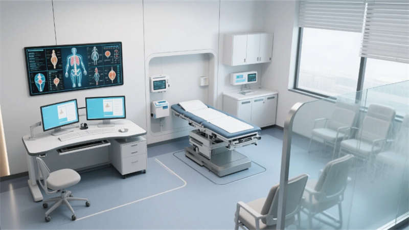 空間以低飽和度灰綠為基調(diào),原生木紋肌理與仿生曲面造型貫穿各區(qū)域,形成視覺連續(xù)性。主入口大廳通過挑空木格柵天花引入模擬天光,曲面導(dǎo)診臺整合智能導(dǎo)航系統(tǒng),落地窗外的療愈庭院模糊室內(nèi)外界限。診室采用霧化玻璃隔斷保障私密性,模塊化醫(yī)療設(shè)備帶與升降診療桌形成靈活工作界面,電子解剖圖譜墻實(shí)現(xiàn)醫(yī)患可視化溝通。