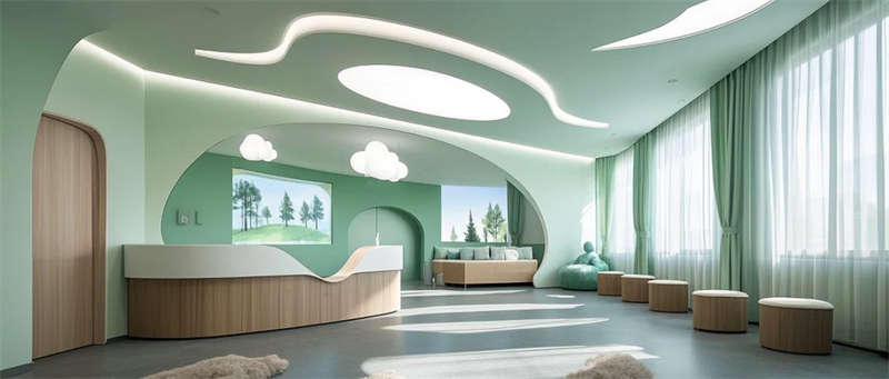 這個(gè)醫(yī)療空間以自然療愈為語言重塑傳統(tǒng)醫(yī)院體驗(yàn)。建筑內(nèi)部流動(dòng)的淺木與灰綠色系,搭配原生綠植景觀墻,模糊了室內(nèi)外邊界,讓自然光與綠意成為治愈媒介。門診走廊的弧形墻面消解機(jī)構(gòu)冰冷感,兒童診區(qū)的森林投影與云朵軟包,用敘事化設(shè)計(jì)緩解診療焦慮。