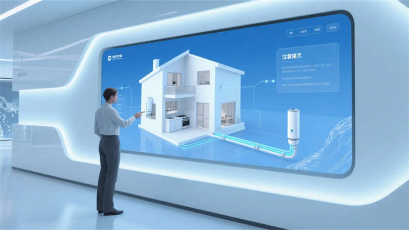 展廳以環(huán)形動線串聯(lián)六大核心模塊:入口10米寬LED水幕墻動態(tài)演繹凈水原理;中央懸浮式產(chǎn)品矩陣展臺,通過全息投影拆解RO膜過濾技術(shù);實景化場景區(qū)1:1復(fù)刻家庭廚房、商務(wù)辦公樓及工業(yè)廠房,搭配交互式水質(zhì)監(jiān)測實驗臺;獨創(chuàng)的“虛擬管家”AR系統(tǒng),可生成個性化凈水方案并投射至合肥典型戶型模型??臻g頂部采用參數(shù)化設(shè)計的波浪形燈網(wǎng),象征長江與淮河水系交匯,地面嵌入城市節(jié)水?dāng)?shù)據(jù)可視化地磚,凸顯本土環(huán)保責(zé)任感。