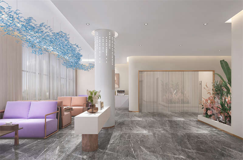 大廳,極致簡(jiǎn)單的配色,與富有質(zhì)感的材質(zhì)碰撞,頂?shù)鯚纛佒蹈?、光線柔,烘托出醫(yī)美大廳的柔和氛圍。